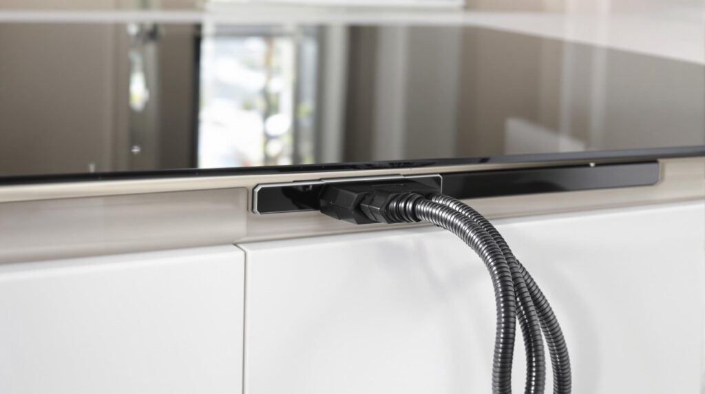 Na het maken van de uitsparing volgt de elektrische aansluiting. Een inductiekookplaat vraagt meer stroom dan een gewone kookplaat. Het typeplaatje vertelt of je een 1-fase (tot 3,7 kW) of 2-/3-fase (7,4 kW of meer) aansluiting nodig hebt. Check je meterkast voor de juiste groep. Een verkeerde aansluiting kan je meterkast overbelasten. Kies de juiste zekering: voor 1-fase meestal 16 ampère, voor 2- of 3-fase 2×16 of 3×16 ampère. Gebruik de juiste kabel, zoals een 5-aderige kabel voor een 3-fase aansluiting.